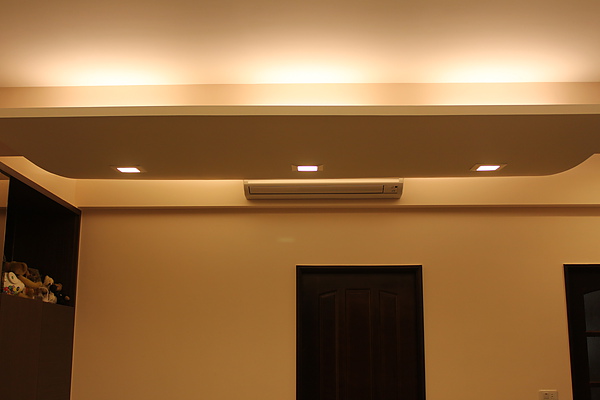 客廳與餐廳共用一台,隱身在天花板的裝飾旁,但是卻不會因此擋到出風口進而影響冷房或暖房的效果,